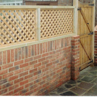 this garden wall with a wooden lattice fence and gate makes an attractive addition to the house